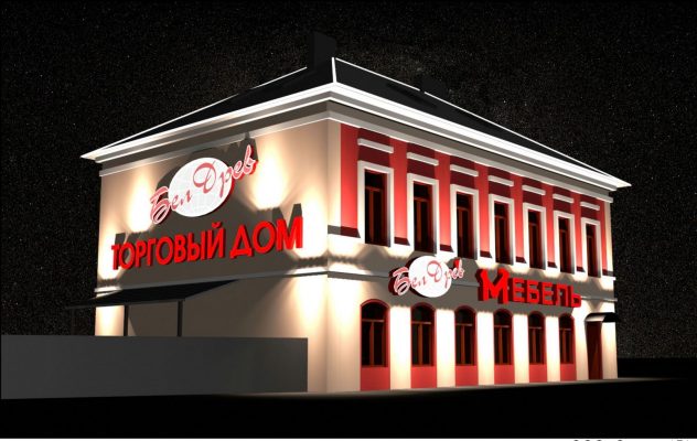 Вывеска БелДрев, магазин Мебель. Объемные световые буквы, объемный световой короб. Прозрачный пластик, светодиодная подсветка.